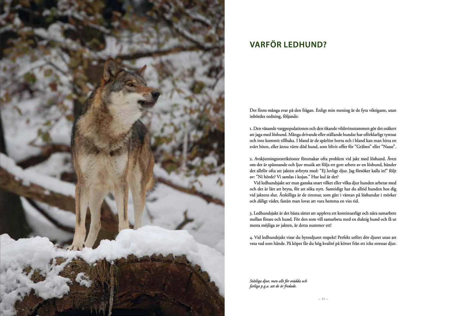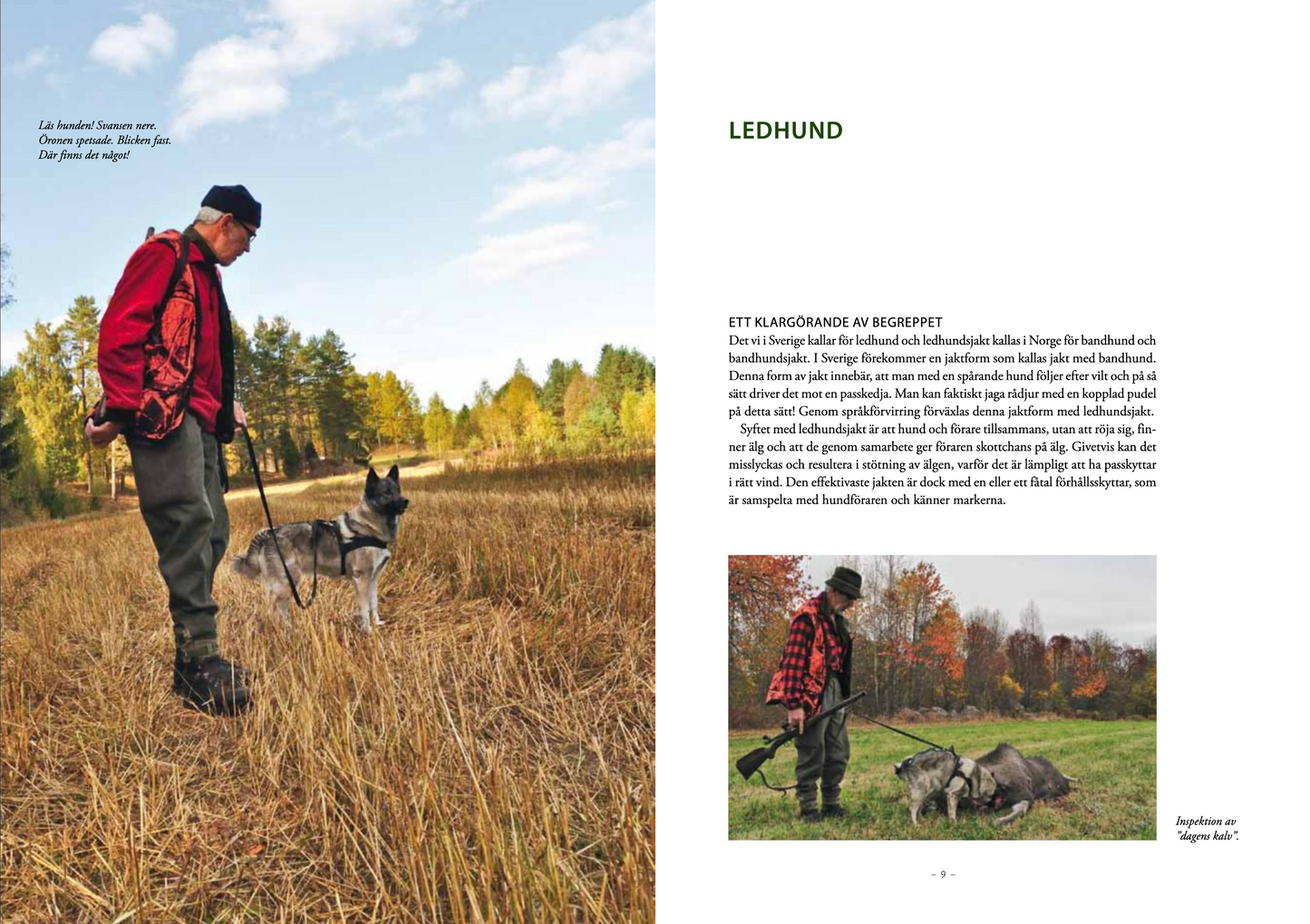 Detta är den första svenska boken om ledhundsjakt. Jaktformen är ännu inte speciellt utbredd i landet, men intresset för jaktmetoden ökar markant p.g.a. ökad rovdjursförekomst (läs varg). Dessutom är det den ultimata jaktformen om man har lika stort intresse för hunddressyr som för jakt.