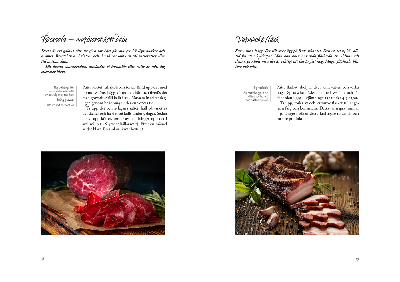 Boken visar tillverkning av olika sorters skinka, tunga, bresaola, torkat kött, rostbiff, rimmat kött, rökt fläsk, leverkorv, terriner, pastejer och patéer, charkuterier på fisk och inte minst alla ljuvliga korvar.