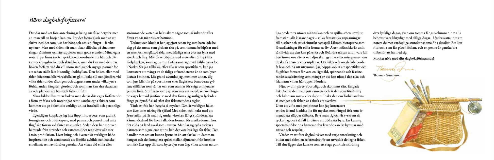 Dagboken är samtidigt en presentation av konstnären Thommy Gustavsson och är mycket smakfullt illustrerad med härliga vinjetter och akvareller. Thommy är en välkänd tecknare, målare och skribent. Och har i många år arbetat som illustratör och skribent i svensk sportfiskepress. Samt medverkat i flera böcker.