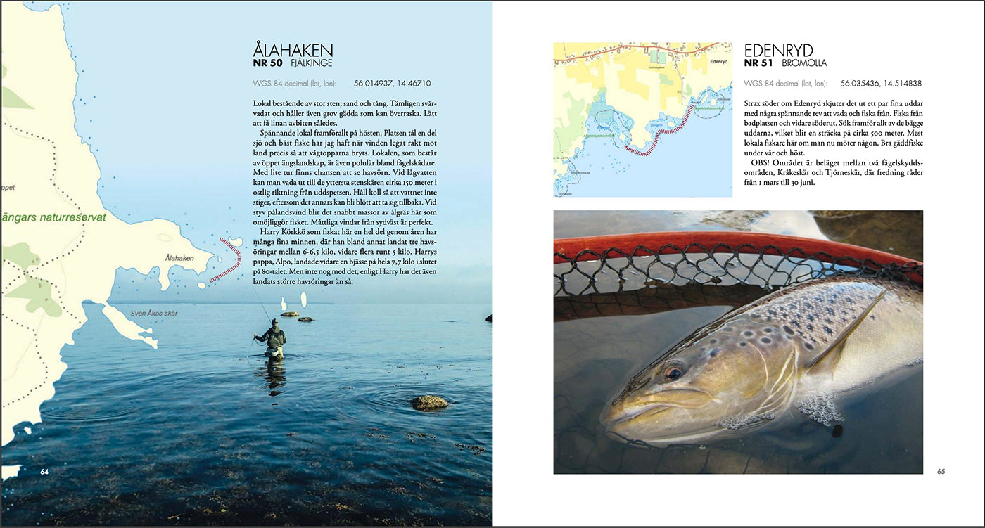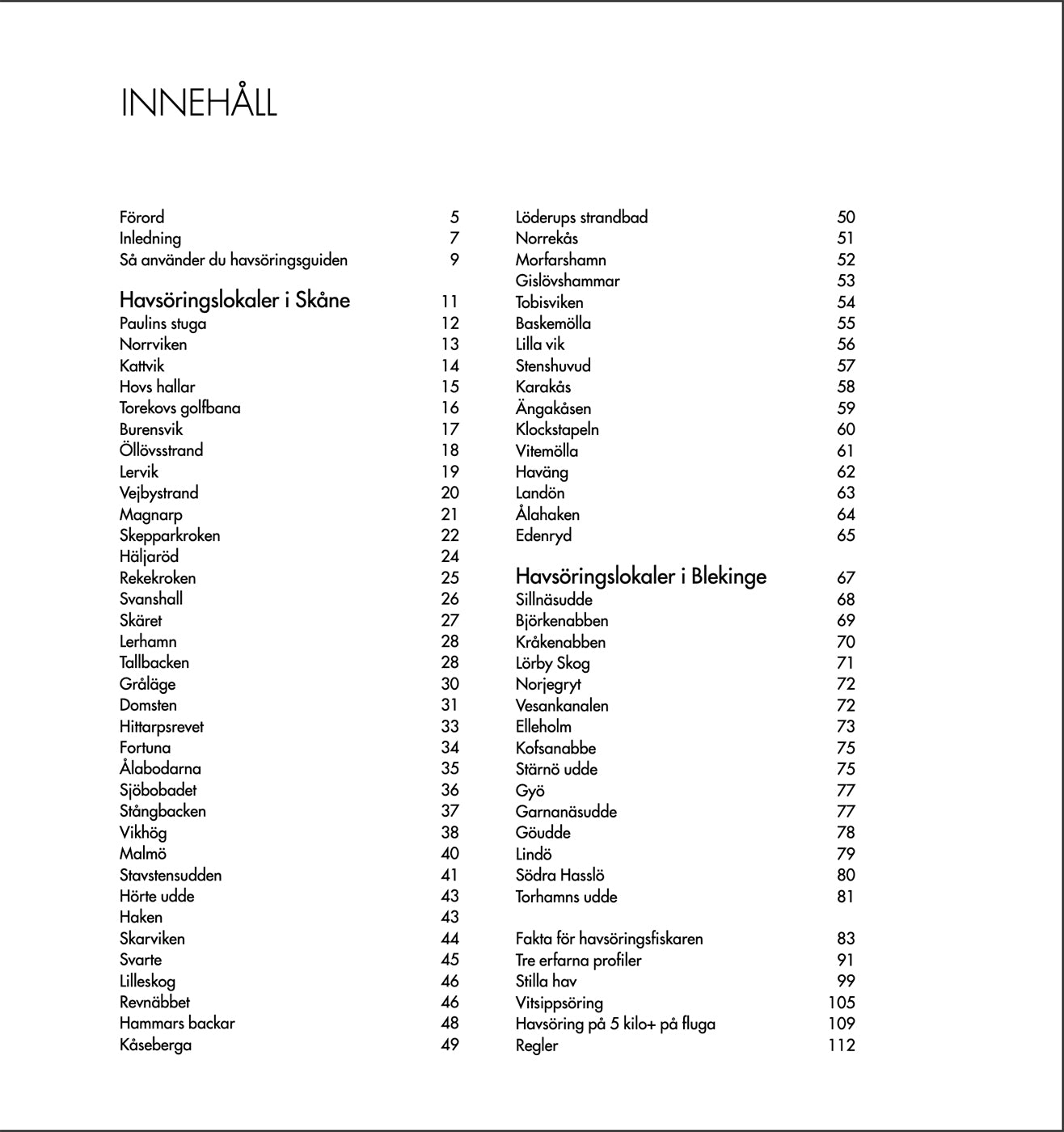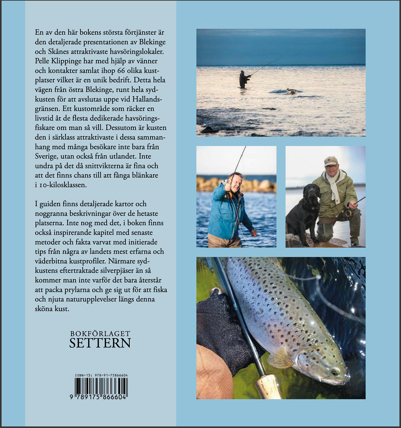 HAVSÖRINGSGUIDEN Skåne - Blekinge största förtjänster är den detaljerade presentationen av Blekinge och Skånes attraktivaste havsöringslokaler. Pelle Klippinge har med hjälp av vänner och kontakter samlat ihop 66 olika kustplatser vilket är en unik bedrift. Detta hela vägen från östra Blekinge, runt hela sydkusten för att avslutas uppe vid Hallandsgränsen. Ett kustområde som räcker en livstid åt de flesta dedikerade havsöringsfiskare om man så vill. Dessutom är kusten den i särklass attraktivaste i dessa sammanhang med många besökare inte bara från Sverige, utan också från utlandet. Inte undra på det då snittvikterna är fina och att det finns chans till att fånga blänkare i 10-kilosklassen.