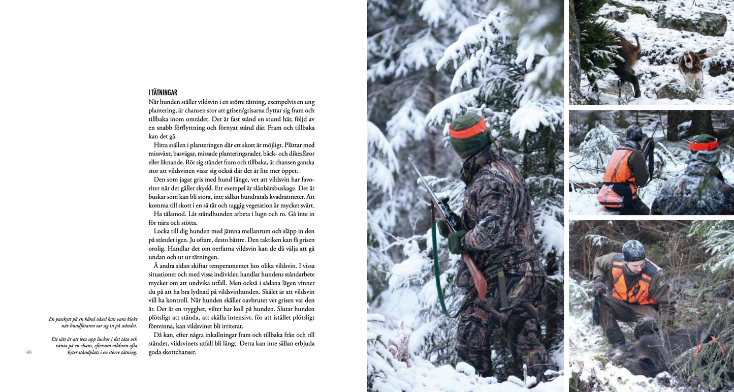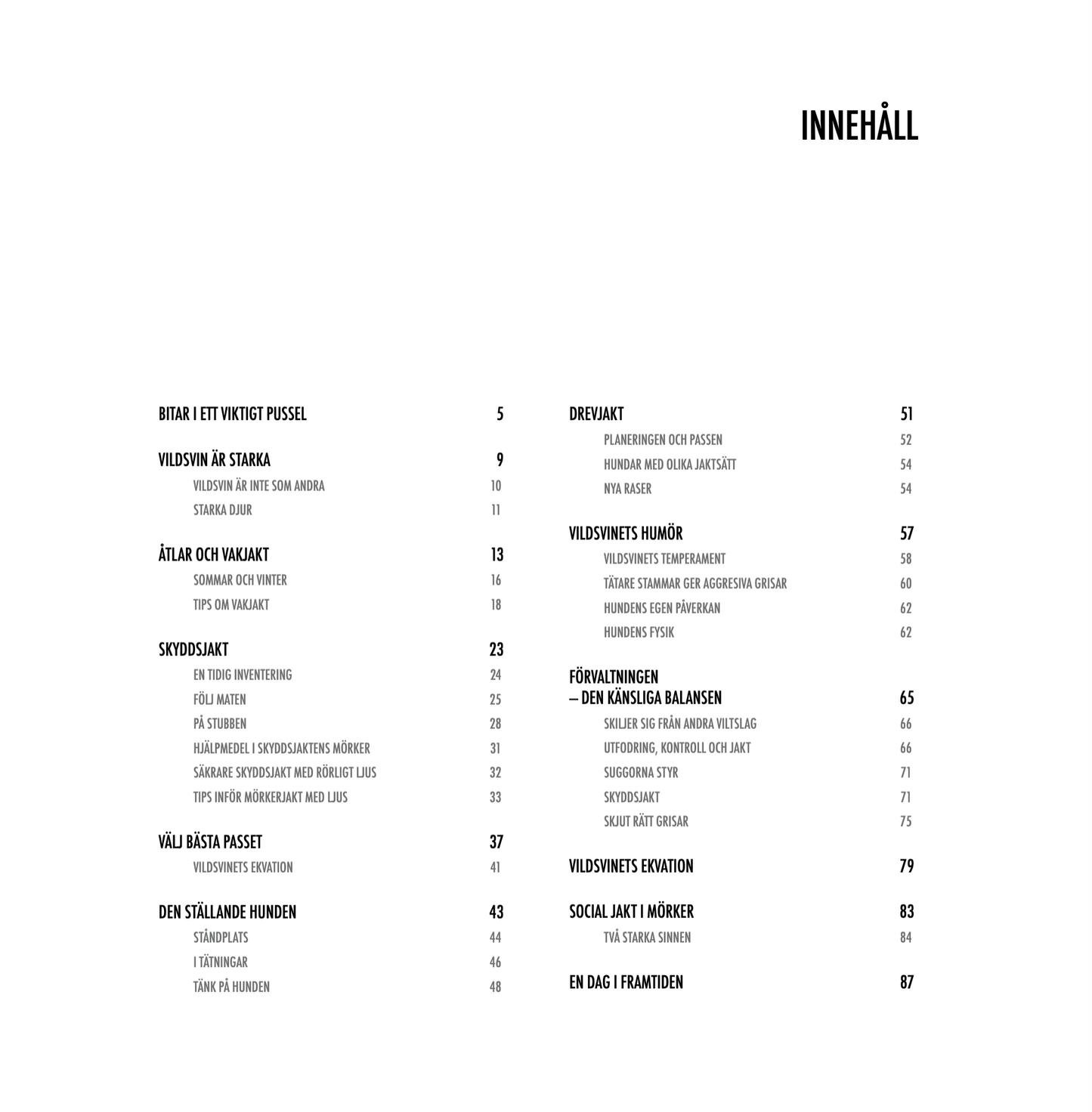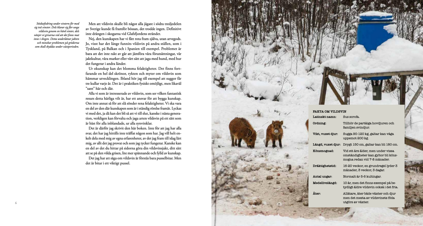 I den här boken hittar du funderingar och tips om åteljakt, vakjakt, skyddsjakt, drevjakt och löshundsjakt. Här finns kapitel om hur vildsvin lever och om hur en klok förvaltning av stammen kan se ut. Du kanske är van vildsvinsjägare. Eller nybörjare. Det spelar ingen roll. Alla kan hitta något mellan dessa pärmar som gör jakten på vildsvin ännu mer framgångsrik ur något perspektiv. För så är all jakt, ingen blir någonsin fullärd.