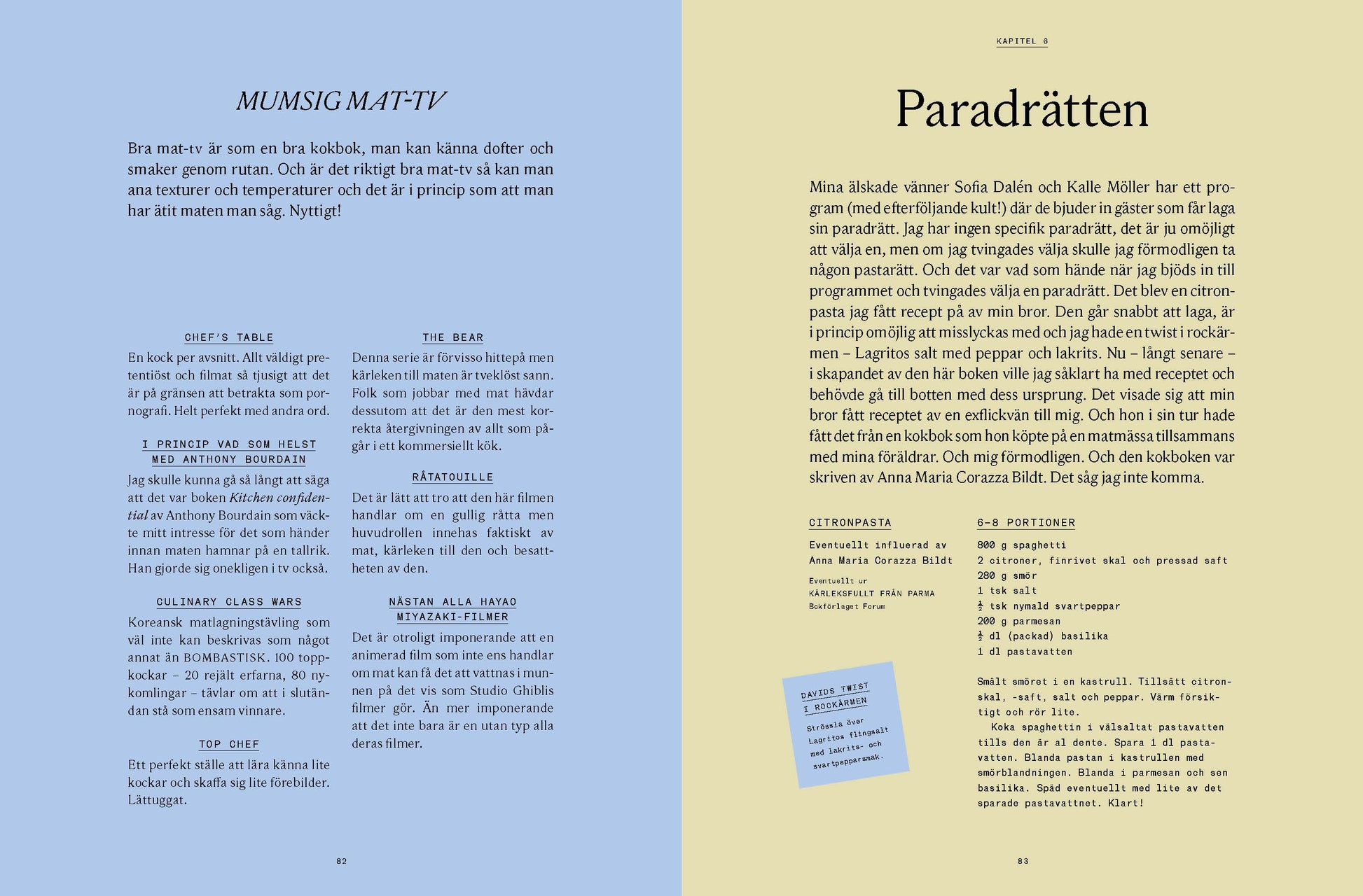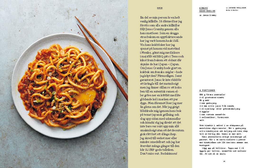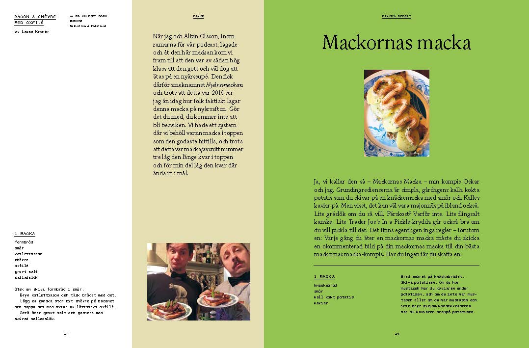 Det här är en bok för alla som tycker om när det är gott inuti munnen. Men det är inte exakt en kokbok. Det är en kokboksbok. En bok om kokböcker. David Sundin älskar att äta gott och har därför samlat på sig "ett par hundra" kokböcker. Hans matintresse fick honom och kollegan Albin Olsson att starta podcasten 80 Väldigt Goda Mackor Podcast där duon pratade mat samtidigt som de lagade sig igenom Lasse Kronérs kokbok från början till slut.