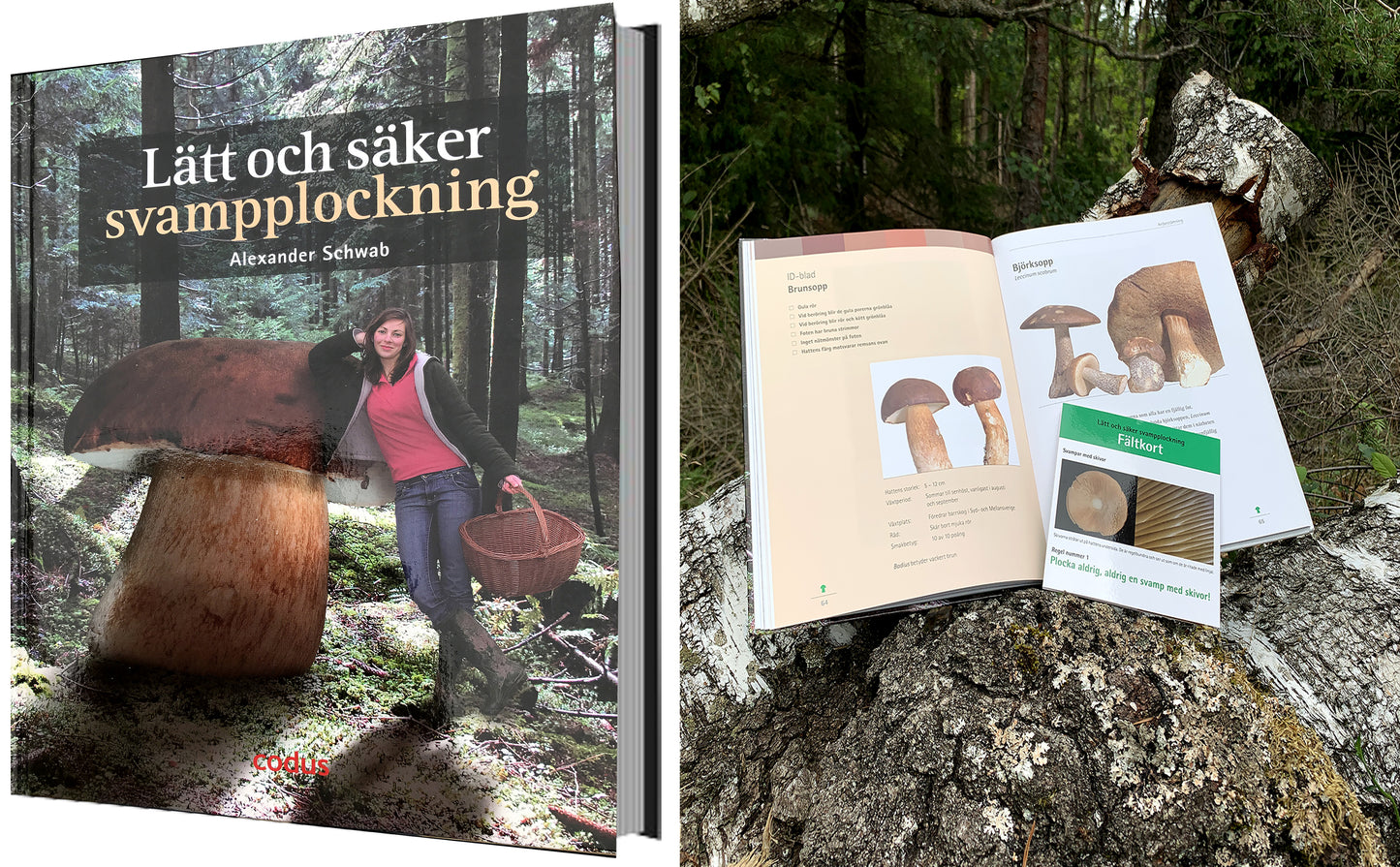 På bokpärmens insida finns ett fältkort som du kan ha med ut i svampskogen för att plocka de ätliga och utsökta svamparna.