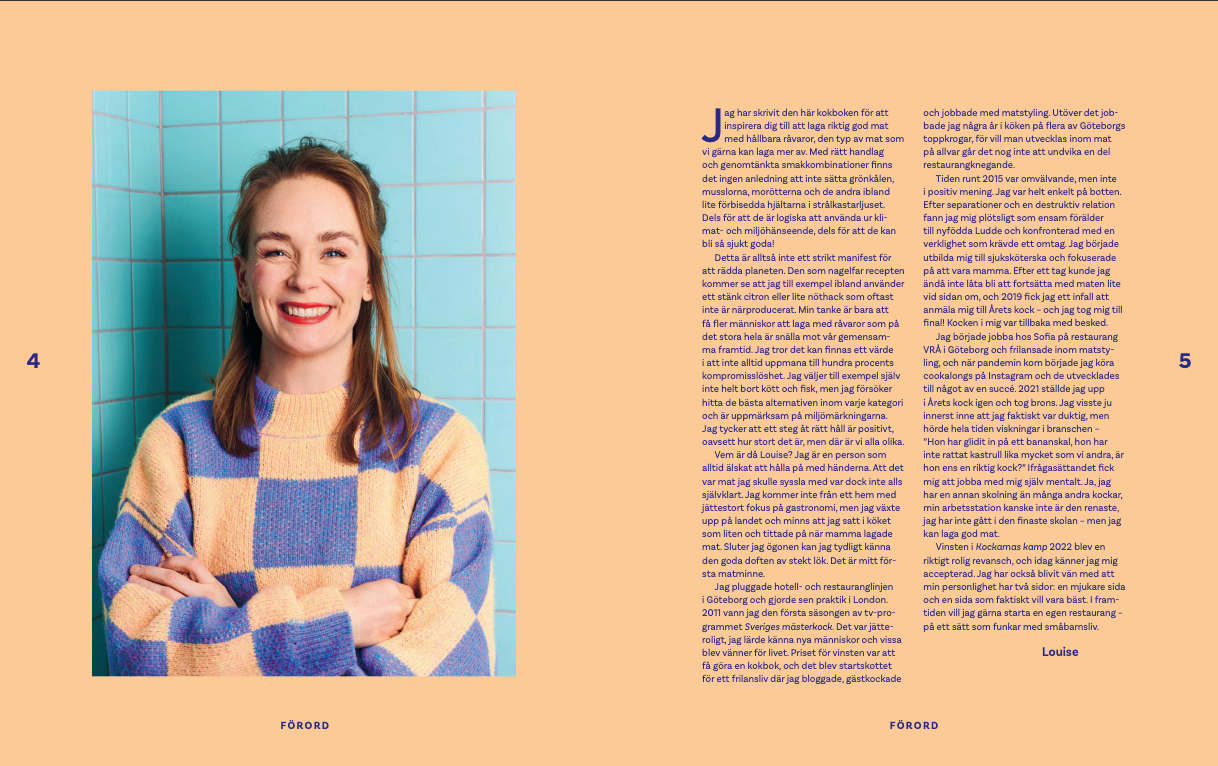 Louise Johansson, vinnare av Kockarnas kamp 2022, kommer nu med sin första kokbok på tio år. Med utgångspunkt i sju svenska råvaror som är hållbara utifrån miljö- och klimatperspektiv inspirerar Louise med ett 70-tal recept på snacks, efterrätter, festrätter och framförallt vardagsrecept.
