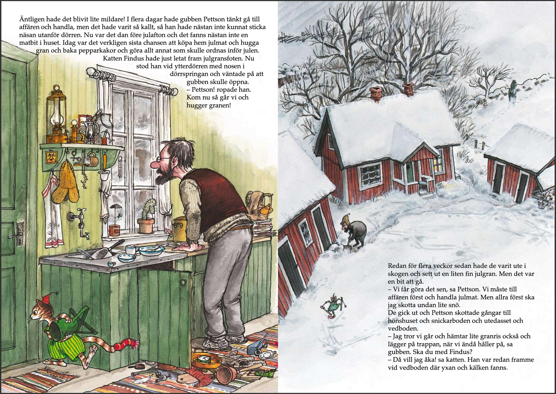 Snart är det jul, och Pettson och Findus ska hålla på med julförberedelser. När de ska hämta granris i skogen med kälken går det alldeles för fort, kälken kraschar och Pettson skadar sin fot. Nu kan de inte åka och handla, och de kan inte hämta en julgran. Findus får ta hand om städningen och de tillverkar en julgran av det de har hemma. Men hur ska de ordna med maten? Morötter och potatis är tråkig julmat. Det visar sig att Findus oroar sig i onödan. Grannarna kommer en efter en och har alla med sig något till Pettson och Findus och det blir en riktig trevlig julafton.