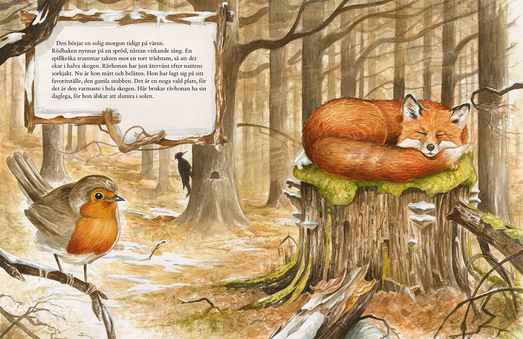 "Casta lyckas på pricken fånga stämningar i naturen samtidigt som initierade fakta om djurlivet förmedlas. Det känns som om man faktiskt befinner sig i gläntan vid stubben och ser, hör, känner och luktar allt som utspelas. De ljuvliga, naturtrogna och suggestiva illustrationerna, som samspelar fantastiskt med texten, är gjorda av den skickliga illustratören och konstnären Mattias Olsson." Betyg 5/5