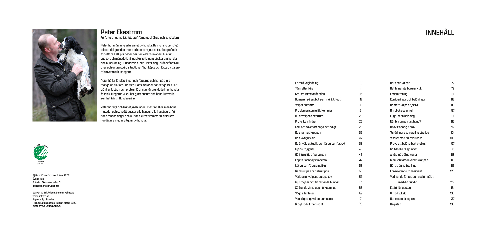 Peter har mångårig erfarenhet av hundar. Den kunskapen utgör till stor del grunden i hans arbete som journalist, fotograf och författare. I ett par decennier har Peter skrivit om hundar i vecko- och månadstidningar. Hans tidigare böcker om hundar och hundträning, Hundskolan och Inkallning från ståndskall, drev och andra svåra situationer har köpts och lästs av tusentals svenska hundägare.